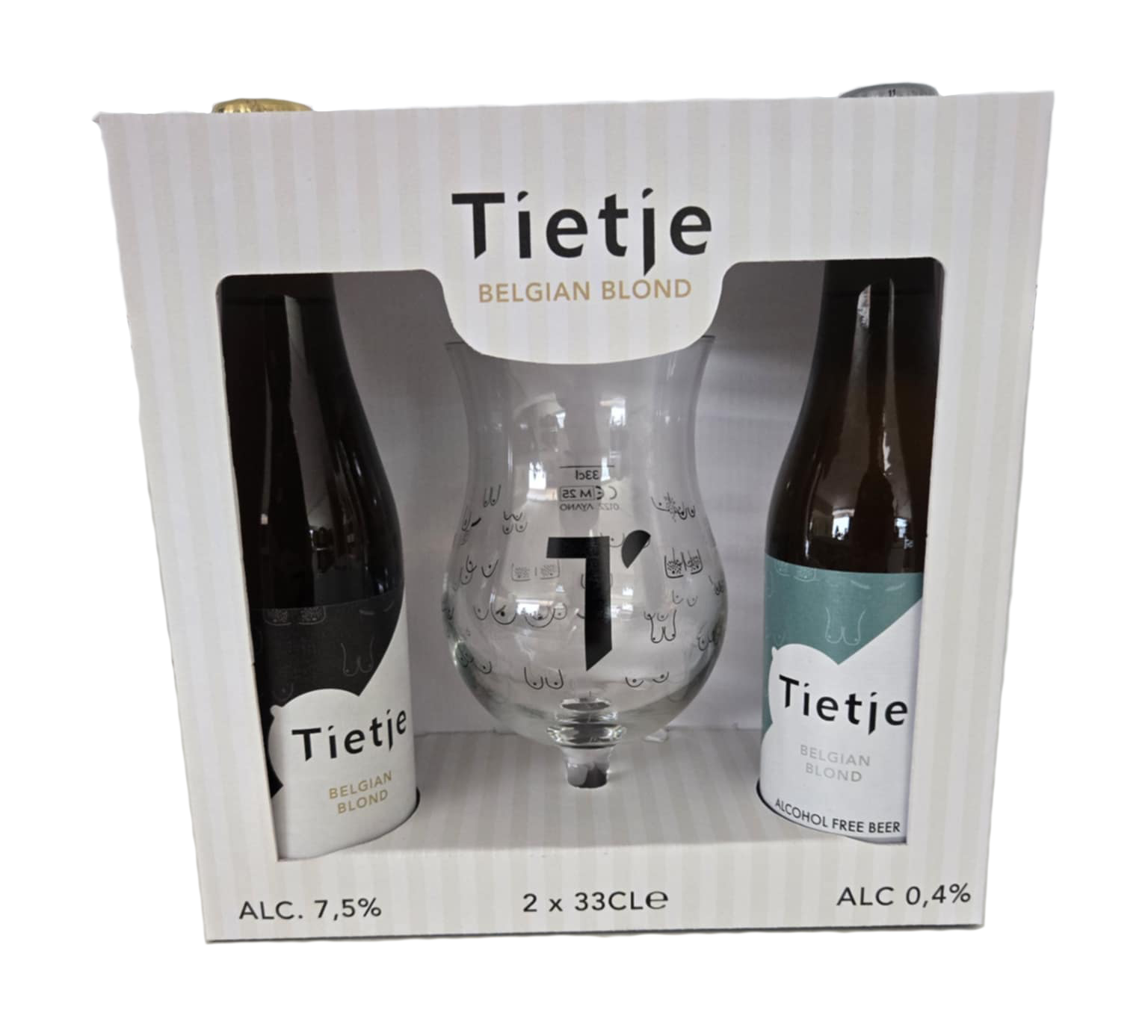Heb je iets te vieren of ben je op zoek naar een leuk en origineel cadeau? Met de handige geschenkverpakking tover je gegarandeerd een lach op ieders gezicht. In een handige duurzame verpakking ontvang je 1 flesje Tietje Blond 33 cl en 1 flesje Tietje Blond alcoholvrij 33 cl. Natuurlijk kan het originele Tietjesglas hierbij niet ontbreken.